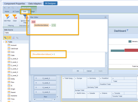 When set to True, the Data Table incorporates the Start and End Date used in the POV / Time Profile for the Cube View and creates two additional columns in a Date/Time Field Type Format; StartDate, EndDate for each row in the dashboard. This allows for the ability to utilize the Date Grouping functions in the BI Designer. Set this to False to not add or display these Date Time fields.