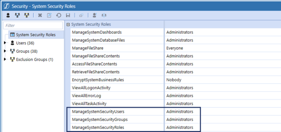 Manage System Security allows non-administrators to manage users, roles and groups and facilitates a comprehensive, functionally-tailored way to separate user and group responsibilities.