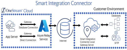 In contrast to a direct data source connection established using a VPN, Smart Integration Connector makes an indirect connection to data sources. Smart Integration local gateways integrate with on-premises customer environments through a cloud hosted service called Azure Relay. The locally installed and configured local gateway server makes the direct connection to data sources and responds to the OneStream application.