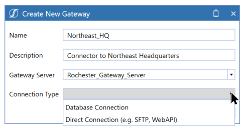 A gateway direct connection represents a point-to-point channel to specific remote network resources such as an sFTP server or Web API (including iPaaS services).