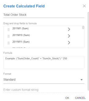 Calculated Fields - The calculated field feature allows users to create custom fields which are not present in the actual data. Users can create these fields using basic mathematical expressions collaborating with existing fields. See Appendix A for syntax.
