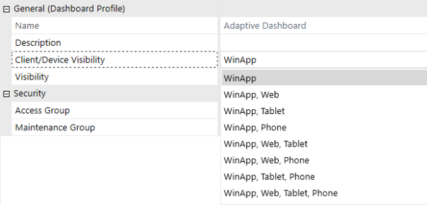 To ensure dashboards are only rendered within the client (Windows Application or browser) or device (PC, tablet, or phone), a new configuration has been added to the Dashboard Profile called Client/Device Visibility.
