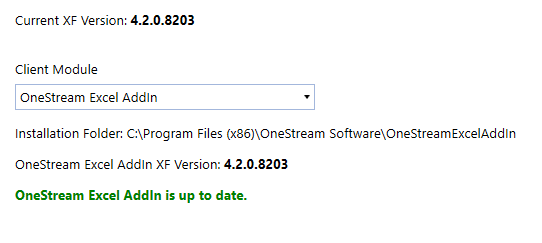 Use this field to select which application (OneStream Excel Add-In) to compare to the current version of each that are currently installed on the user’s desktop. Click the selection arrow and select the appropriate application. If the versions do not match, click Update and then OK.