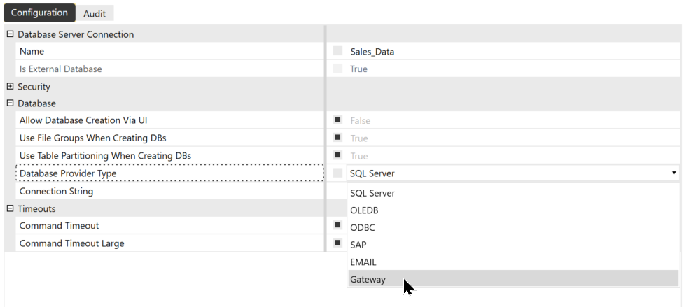 After the Gateway is selected, the Data Source Name drop-down menu populates with a list of the Local Gateway Server Database Connections.