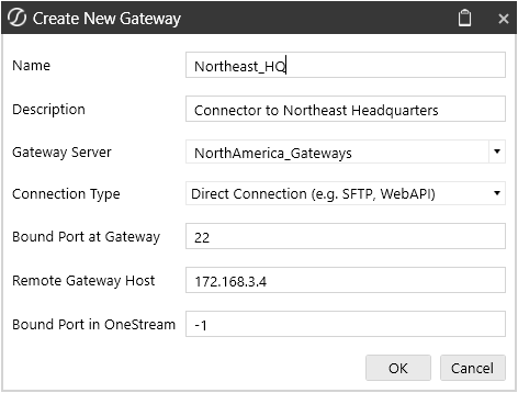 This is an customer defined port that can be referenced in data management or business rules to directly access services such as sFTP and WebAPI. This must be a globally unique port in a OneStream deployment environment per direct connection and should be a TCP port number > 1024 and <65535. When creating the gateway, use -1 and OneStream will automatically assign an open port. |