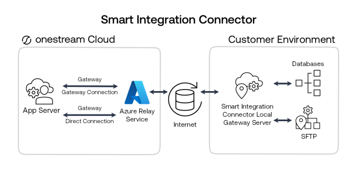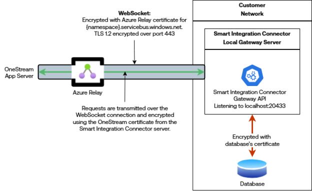 Local Gateway Server: Instances of the Smart Integration Connector Local Gateway Server are installed inside your network and configured to make direct connections to designated data sources. The Smart Integration Connector Local Gateway Server runs as a Windows service and brokers communication between local data sources and Azure Relay using an outbound connection over port 443. All communication is encrypted end to end through TLS.