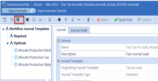 After the template is configured, users can load it directly into OneStream during the Workflow process. While the Journal Input type is selected, click the icon in the Journal toolbar. This lets you select the desired Excel or CSV template and load it into OneStream. After the file is loaded, the journal line items will appear in the journal and the user can save it to the Cube.
