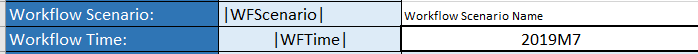 Enter the Workflow Time or make the template dynamic by entering the |WFTime| Substitution Variable. Workflow Time support two fields. The available cell immediately to the right is option representing the CubeTimeName.  This field can be used when the Scenario’s Workflow Tracking Frequency is Yearly, and the Input Frequency is Monthly. For example, the Workflow Time would be |WFTime| or 2019 and the CubeTimeName would be the period to post, 2019M7.