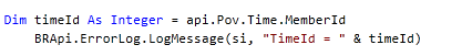 Api.Pov.Time.MemberId is obtained from the Time Member Id for the current POV being executed during the calculation. The Time.MemberId is stored as an unique integer to represent a single Time member. The uniqueness is determined by the combination of the Year and Period.