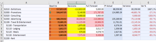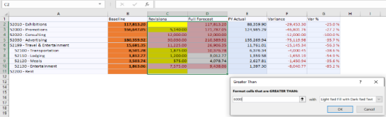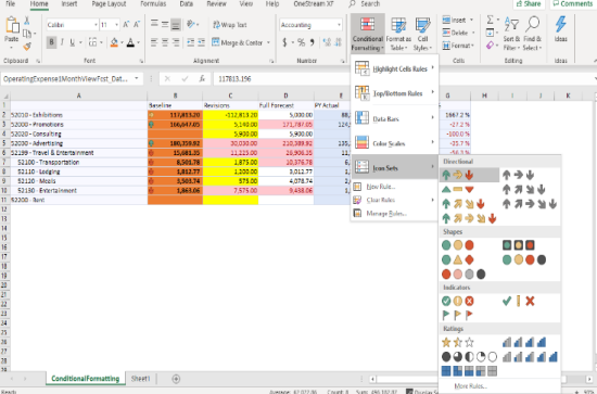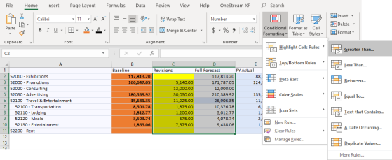 Use Conditional Formatting in Cube Views to visually explore and analyze data. You can highlight cells or ranges of cells, identify key values, and represent data using data bars, color scales, and icon sets that correspond to specific variations in the data. If there are any existing formats prior to applying Conditional Formatting, they will be retained if the range of cells containing the conditional formats do not meet the conditions of the rule. All styles from the cube view and the selection styles that had been previously applied to that range are overridden by conditional formatting.