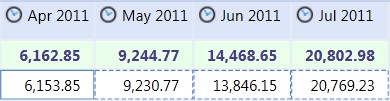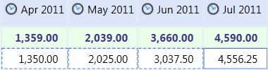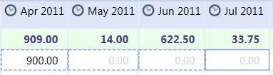 This takes the Amount to Spread and distributes it with a weight of 4 to the first selected cell, a weight of 5 to the second cell and a weight of 4 to the third.