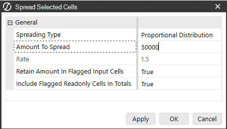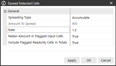 Specify the value to spread over the selected cells. The value defaults to the last cell selected. The way the amount in this field spreads varies by Spreading Type.