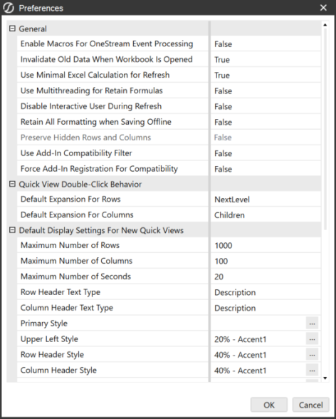 Set Preferences for how to interact with and display your OneStream data. Settings include: