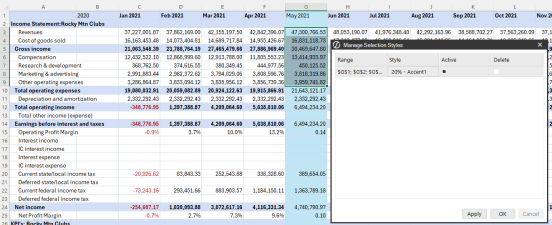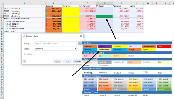 You can bring an existing cube view into Excel or Spreadsheet and format using functionality that is included in Excel, to create highly formatted reporting. You can also modify it locally as well as in spreadsheet. You can use existing cube view formatting, add new styles to apply changes to rows, columns, or cells, or a combination of existing styles with new styles, and add conditional formatting.