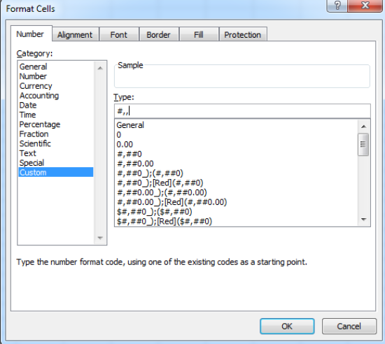 Finally, under Type, enter the custom formatting. This example will be formatting for Millions. (#,,)
