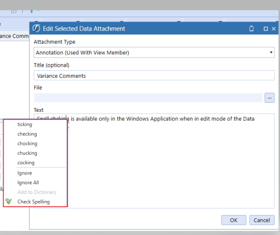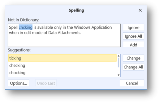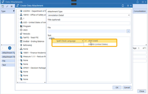 Spell Check options will be available when creating or editing Data Attachments. Once enabled, the spell check feature will actively check spelling in Data Attachments. The Spell Check will be applied to all Data Attachment dialogs once turned on.