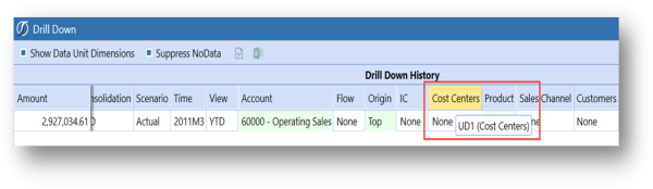 The Drill Down window displays the custom User Defined Description as the default header. If no custom description is created, the dimension type label, such as UD1, will display. See Application Properties and then User Defined Dimensions (Descriptions) for more information.