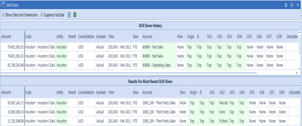 This drills into all of the base stored data within the full Data Unit (Cube, Entity, Parent, Consolidation, Scenario, Time and View), so this is a much broader result set than the initially drilled data.