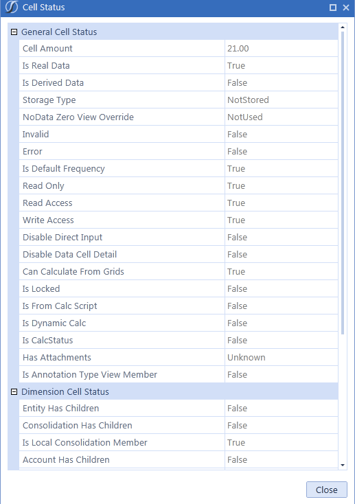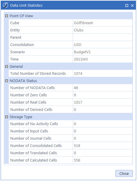 Right click and select Data Unit Statistics in order to see details on the selected cell’s Data Unit. (Number of: zero cells, real cells, derived cells, NODATA cells, calculated cells, consolidated cells, translated cells, journal cells, input cells, etc.)