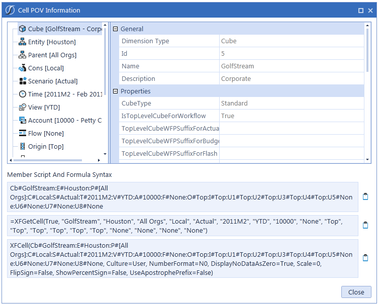 Right click on any cell and select Cell POV Information in order to see a detailed summary of the selected Members related to this intersection. All the major properties of these Members can be seen from this dialog.  The full Member Script and formula syntax to get to this value is also displayed. Users can use the clipboards to copy and paste the retrieve functions. The XFGetCell formula can be copied in this dialog and used in an Excel file to retrieve this specific data in Excel. The XFCell formula can be copied in this dialog and used in a text file, such as Word or PowerPoint, to retrieve this specific data in an Extensible Document. See Extensible Document Framework in Presenting Data With Extensible Documents for more details on this retrieve function.