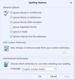 The Options button will allow the user to modify the Spell Check behavior within the current task session. These settings are never saved as a user preference.