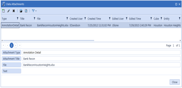TIP: This attachment can be viewed from any data grid that employs a Workflow Unit, Scenario, and Period.  To view all data attachments for any Workflow Unit, Scenario and Period, right click on any cell and select Data Attachments For Selected Data Units. This ensures that all data attachments become valuable analysis tools.  This is part of the View Dimension because each is given a Type and the data attachments can be reported on as a whole and included in other types of reports.
