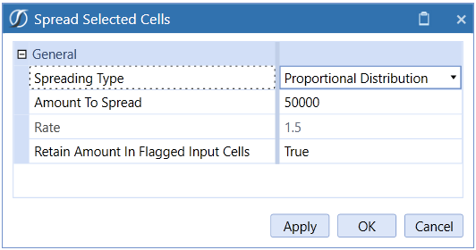 NOTE: The Spreading Dialog can be left open while entering data.  If the dialog is left open while users are spreading values on the grid, it will update to the respective spreading behavior.