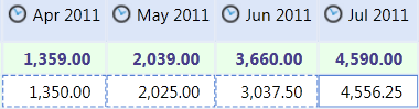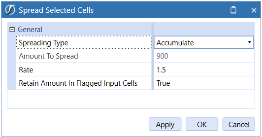 Specify the value to spread over the selected cells. The value defaults to the last cell selected. The way the amount in this field spreads varies by Spreading Type.