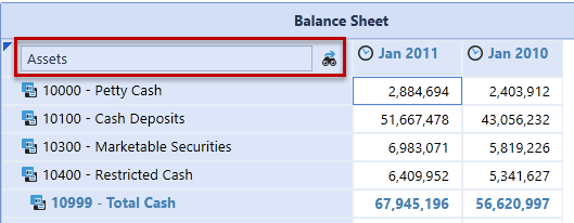 When viewing a Cube View with a large number of rows, use the search filter at the top of the screen in order to navigate to the desired row. Type a keyword into the search filter and click the Find Next Row icon in order to navigate to the preferred row. Continue clicking the icon in order to navigate to any row with the keyword included in the row header name. This also works when rows are collapsed.