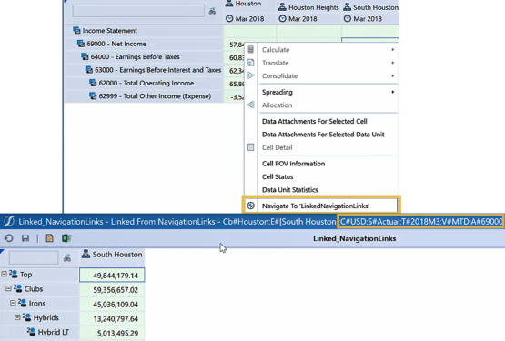 Right-click cells to navigate to the linked view, retrieving data for the specified point of view parameters that are also identified in the header.