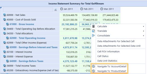 9. Run ProductDetail from IncomeStatementSummary, right-click cells and select Navigate To ProductDetail_2.