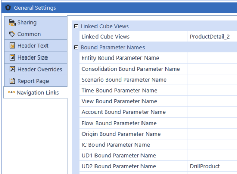 If any Bound parameters need to be entered (in this example, the same Bound parameters are used for both cube views), enter them under Navigation Links in General Settings.