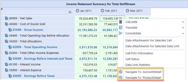 In the example above, the ProductDetail Cube View was assigned to the Net Sales row. When a user right-clicks on a Net Sales cell in the Data Explorer grid, Spreadsheet tool, or Excel Add-In, this cube view is available.