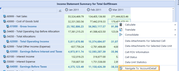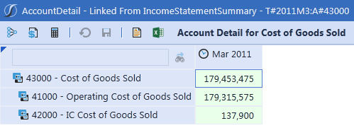 The AccountDetail cube view will display Account details based on the selected data cell. The IncomeStatementSummary’s data displays Parent accounts for a specific time, so the AccountDetail’s data will display the selected Account’s children for that same time period.
