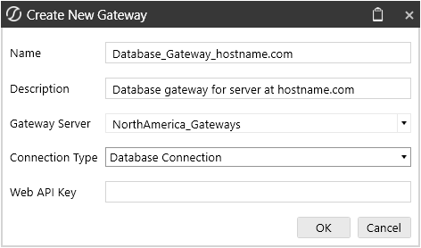 NOTE: Each Gateway Server will only have one Database Connection and as such we recommend naming it "Database_Gateway_" followed by the name used for "Gateway Server." This will differentiate the Database Connection Gateways in future steps.