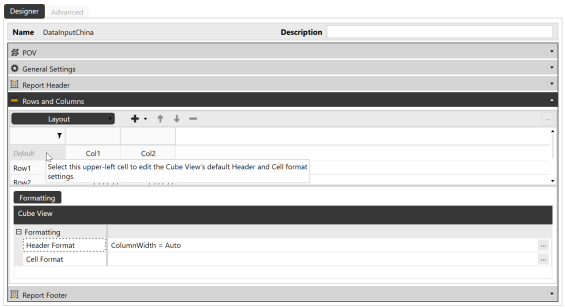 Users with the appropriate privileges can open the Cube View Designer by selecting the option from the cube view toolbar and hidden context menu. When the Cube View Designer dialog is opened, a copy of the originating cube view is rendered in the dialog. Users can view and/or edit the row and column layout, expansion levels, member filters, display format definitions, data configuration settings, and general row and column templates. Please note the following differences between the Windows application and browser designer interfaces: