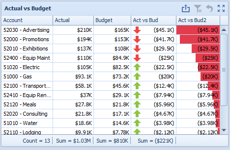 The name of the grid component is Actual vs Budget and this along with the column Account is the source of the Action Name Value Pairs property used in the example above. The result is that anytime an account (or multiple accounts -if setup) is selected at runtime, that selected account value(s) will be passed to the designated bound parameter (AccountNumber).