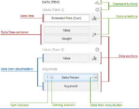 Data Item: Identifies data binding by mapping to a specified data source field. Each data item has the Data Item menu button, used to invoke a menu that allows you to perform various data shaping operations.