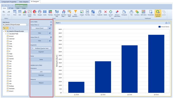 The Data Items pane is placed side-by-side with the data source browser and allows you to create and modify data binding using drag-and-drop operations.
