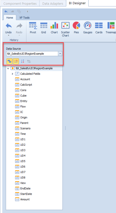 Data Source Drop-Down List Allows you to select the required data source and its required data member. The command buttons pictured below are available to sort or group fields in the browser.