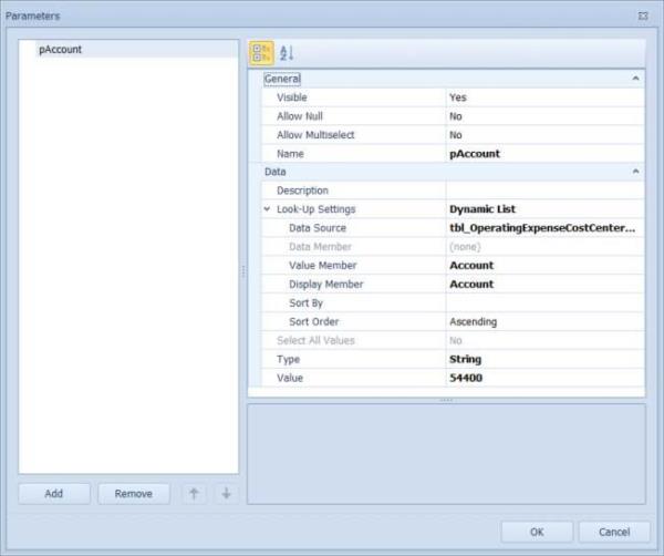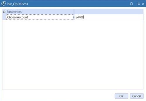 In this case notice how the value property was set to 54400. This is due to the Parameter Name Value Pairs property set earlier (pAccount=|!ChosenAccount!|). The value of this BI viewer parameter called pAccount was assigned to the value of the OneStream bound parameter |!ChosenAccount!|.