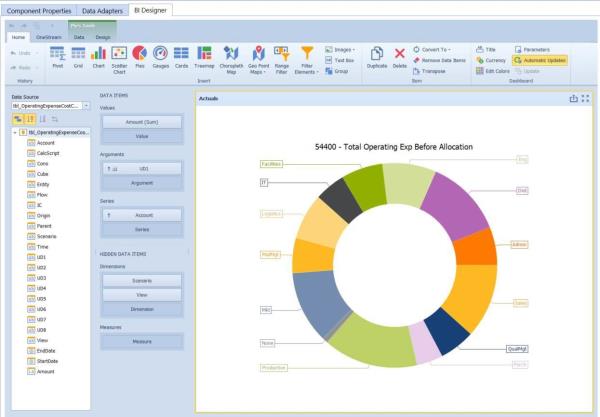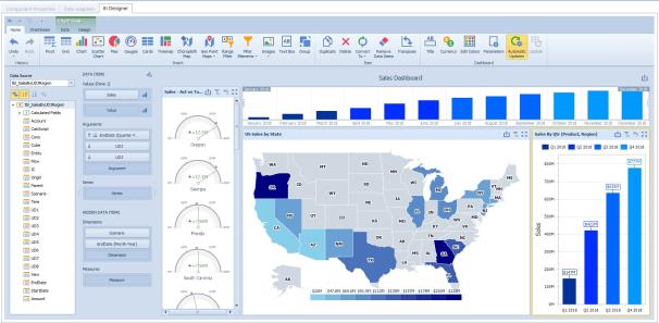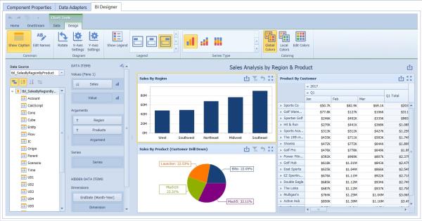 The BI Designer layout provides an intuitive user interface that facilitates data binding, shaping, and layout design. Many of these normally complex tasks can be accomplished with a simple drag-and-drop operation, allowing you to start creating dashboards immediately. This BI Designer contains rich, intuitive graphics and tools that will assist in analyzing data with functionality that requires little to no coding. Users would be able to combine multiple views of data to get better insight to their information, perform ad hoc analyses and quickly publish their dashboard to share it within the application.