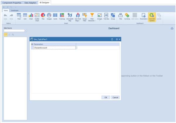 The BI Designer has its own section for parameters. These parameters can be used to filter the BI viewer and to pass values from the BI viewer components to other dashboard components (outbound parameters) outside of the BI viewer.