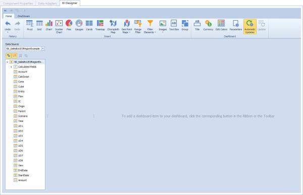 Once the BI Designer is selected the user is presented with the controls that provides the capability to build a functional dashboard. The dashboard provides elements that display visual or textual information in a dashboard known as dashboard items. These Dashboard items can be divided into the following groups: data visualization items, filter elements and dashboard item containers. To visualize data within dashboard items, you need to first establish a connection to a data source as mentioned above. The data source collects the data adapter data and passes it to the dashboard.
