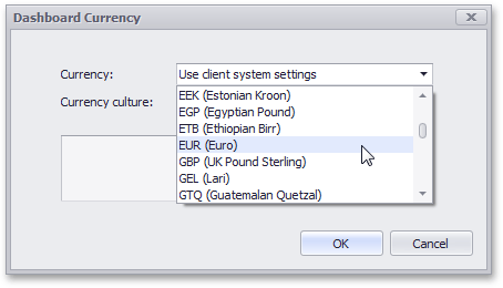 You can also specify the default currency for the dashboard. This setting will be applied to dashboard items that have no currency defined.