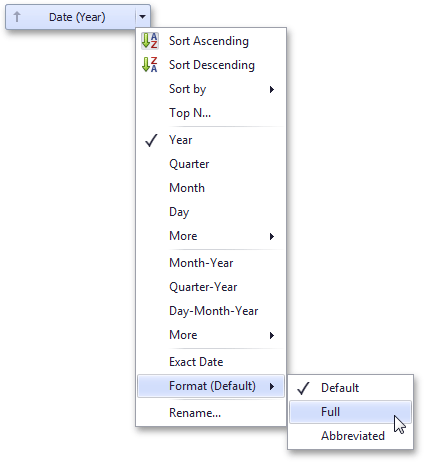You can arrange dimension values in groups of different sizes by specifying the appropriate group interval. For instance, date-time values can be grouped by years, months, quarters, etc.