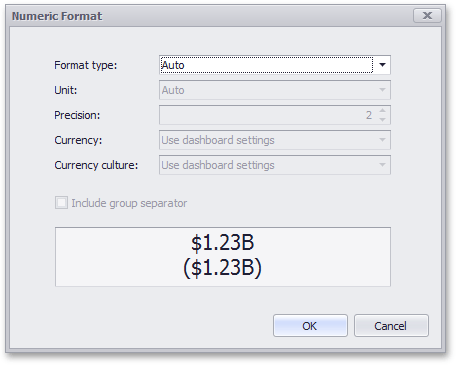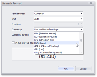 The Dashboard allows you to specify a currency format at two levels: for the entire dashboard and for individual Data Items.