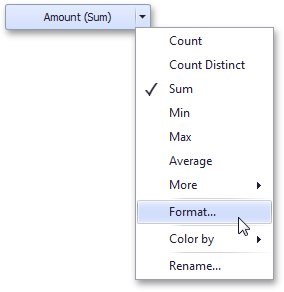 To specify which currency to use for a particular data item, select Format from the data item menu.