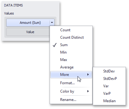You can change the summary function type for numeric measures. To do this in the Designer, invoke the data item menu and select the desired summary type. Less common summary types are organized in the More sub-menu.