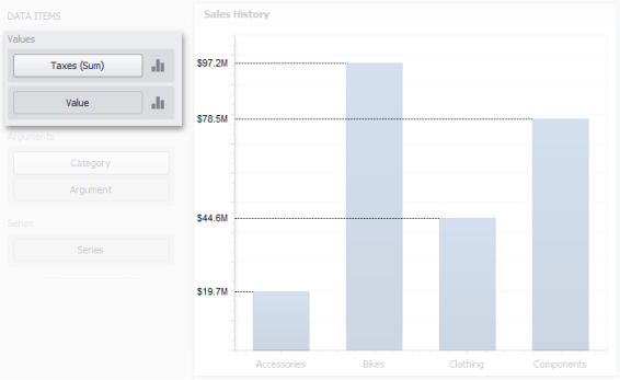 If the selected dashboard item contains several types of elements that can be used for drill-down, the Ribbon or Toolbar will provide the appropriate buttons to switch between these types (e.g., Arguments and Series buttons in a Chart). For details, refer to the documentation for the individual dashboard items in the Designing Dashboard Items topic.